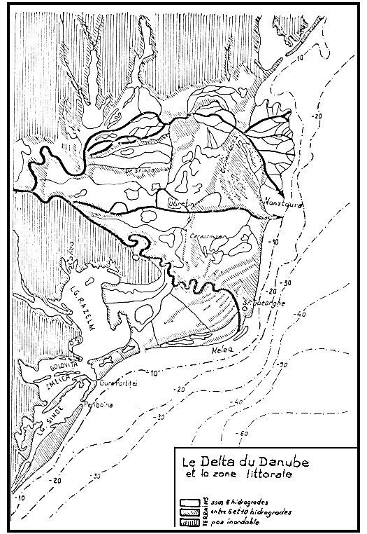 Le Delta du Danube se présente comme une mer de roseaux avec des îles formées par des lacs et des cordons de sable et traversée par les bras du Danube et les cordons fluviaux plus élevés, comme une sorte de bourrelets sur les deux rives, appelés “Grind” des rives. Les vagues qui agitent cette mer de roseaux sont arrêtées à distances différentes, par des canaux d'exploitation; ce sont les seules routes par lesquelles on peut pénétrer dans l'intérieur du Delta. Le Delta a un rôle économique en ascension en ce qui concerne l'exploitation du roseau et du poisson. A l'heure actuelle, c'est la région ayant la plus grande production piscicole et la plus grande perspective de développement de toutes les eaux intérieures de la Roumanie.