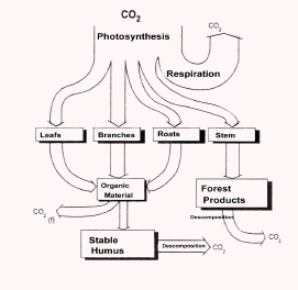 9. Lorsque les arbres poussent, qu'ils tombent malades, meurent ou qu'ils sont décimés par le feu, le carbone qu'ils contiennent est redistribué. Une partie est rejetée dans l'atmosphère, mais, même après un incendie, seule une infime partie de la biomasse forestière est rejetée immédiatement dans l'atmosphère. Le reste aboutit sur la couverture morte et dans les sols où il se décompose ensuite sur un très long délai. Tout le processus s'appelle le cycle du carbone et est illustré à la figure 1 au sujet d'une forêt.