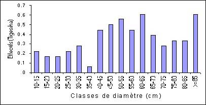 La structure diamétrique initiale de la forêt présente les caractéristiques principales suivantes: La densité d'arbres de diamètre ³ 10 cm se situe autour de 388 tiges/ha (Périmètre 2) à 474 tiges/ha (Périmètre 1). La surface terrière est très faible (G » 19 m2/ha) par rapport aux valeurs obtenues par de nombreux auteurs en forêts tropicales (Rollet 1984; Dupuy et al. 1997). Les volumes sur pieds sont également très faibles (V » 103 m3/ha pour les arbres de diamètre ³ 10 cm toutes essences confondues) avec un volume exploitable (arbres de Æ ³ 50 cm), Ve » 8 à 10 m3/ha.