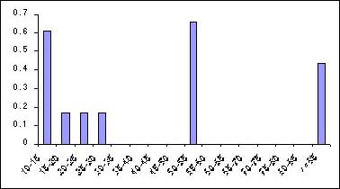 Ö Type 1: Les distributions "erratiques" qui ne suivent aucune loi; les espèces sont en général faiblement représentées dans les petits diamètres (absence de régénération); elles correspondent à des espèces fortement héliophiles représentées ici par Afzelia africana, Ceiba pentandra et Milicia excelsa.