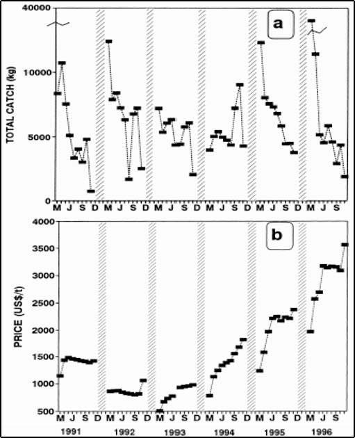 Another picture arises when fishing is recognized to be economically productive even following closure, because of intra-annual price variations inversely related with stock abundance. This is clearly shown in Figure 3.10 for the artisanal Octopus mimus fishery in Caleta Coloso, Antofagasta (Chile). This is a typical shoreline cove where all fishing activities are performed by divers at depths of between 5-20 m. The fishery is regulated only by a closed season from 15 December to 15 March, and it can be defined as an open-access fishery outside these dates. Defeo and Castilla (1998) showed a clear intra-annual pattern in five of the six years analysed (daily data), with catches peaking at the start of the fishing season (March-April: Figure 3.10a). Catches showed an overall downward trend until September-October, at which point they rose slowly, before dropping down to their lowest level at the end of the fishing season. However, unlike the lobster example, the average price paid per tonne of octopus increased from the beginning to the end of the season (Figure 3.10b). The inverse relationship between intra-annual fluctuations in catch or CPUE and those of price suggest short-term changes in price according to resource availability, but also suggest the desirability of reducing early exploitation rates early in the season.