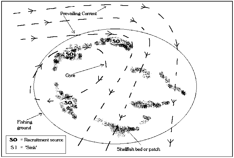 For sedentary species, the source and sink concept evidently needs to be taken into account. Underwater observations over natural shellfish beds (e.g. Caddy, 1970; Stokebury, 2002) have revealed that shellfish aggregation occurs over a range of spatial scales. Stokebury (2002) found some 55 percent of the average harvestable biomass of sea scallops on the Bank occurred within five percent of the scallop fishing grounds, with specific areas of high density within them: a characteristic frequently noted for other shellfish populations. If these key areas are to persist in productivity, this demands that the population spatial distribution must be taken into account in designing a conservation and management scheme, and we are faced by the reality of source and sink populations (Orensanz and Jamieson, 1998). The existence of source populations which contribute to the majority of successful spawning seems to be indirectly confirmed in many cases by the persistence of productive shellfish beds in particular locations. If this is the case, when these become depleted, this reduces the recruitment to the whole population of the area. Indications suggest that for sedentary and semi-sedentary species, such source populations occur at high density within limited locations where a gyre or favourable current system has a higher probability of returning larvae to the "source" bed (Figure 3.1). Examples of such areas for scallop populations are mentioned in Caddy (1979b) for the Bay of Fundy, and by McGarvey and Willison (1995) for Georges Bank. The role of source populations for Georges Bank scallops was commented on by McGarvey, Serchuk and McLaren (1992) who found that 82 percent of egg production from this population came from a small area on the Northern Edge and Northeast Peak of the bank. Larvae distributed elsewhere to less favourable environments may have a lower probability of reproduction due to their lower density. This is a factor of importance to fertilization by broadcast spawners such as most invertebrate resources, which their location ensures a high probability of not returning to the "mother" population. The source-sink hypothesis thus provides a useful concept and guide to management, in that it supposes a lower contribution to population replenishment is more likely to occur for mature individuals of sedentary species scattered outside of source areas, which can therefore be harvested with minor repercussions on the metapopulation. Thus the population patches labelled SO in Figure 3.1 are expected to have a higher probability of producing recruits to the parental bed than for those labelled SI, where although larval life histories may be surprisingly well adapted to a return to parental aggregations, a higher probability of larvae being carried away down current seems implied. The source and sink concept was also invoked for Panulirus argus by Lipcius et al. (1997), and seems one likely option for explaining apparent recent increases in stock range of Homarus americanus from core areas to some grounds (e.g. the upper Bay of Fundy) where lobster stocks were formerly less common when groundfish predators were abundant. The significance of this for the present study is that it suggests that data series be collected where possible from source populations.