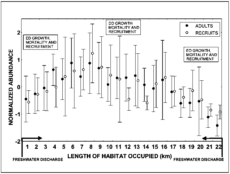 High mortality rates of older crabs close to unfavourable conditions are due to habitat unsuitability and insufficient food. Crabs in unsuitable habitat also show reduced growth rates and fecundity (Figure 3.6). Thus, eggs here are produced only by younger females which significantly decreased their fitness to reproduce and total reproductive output. The absence of recruits here was attributed to hydrodynamic effects resulting in high pre-settlement and early post-settlement mortality rates (Lercari and Defeo, 1999). Recruits were found near the freshwater discharge only during years of good recruitment. However, low growth and high mortality rates precluded many from achieving a size at maturity. By describing this case in some detail, we show that the effects of habitat suitability and stock contraction/expansion may occur at a variety of spatial scales, ranging from meso (e.g. a fishing ground) to megascale (i.e, the entire distribution pattern of a species: see Defeo and Cardoso, 2002), a situation which while it may also apply to fish species, is rarely evident from available data.