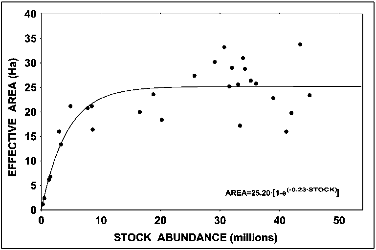 Figure 3.4 Relationship between the effective area occupied by the yellow clam Mesodesma mactroides stock in Uruguayan beaches and the corresponding stock abundance.