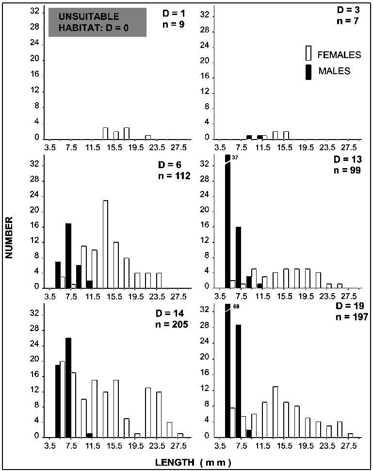 Figure 3.5 Length frequency distributions of the mole crab (Uruguay) discriminated by sex at different distances (D, in km) from the unsuitable habitat, defined by the presence of a human-made freshwater canal. Note the absence of smallest and largest sizes close to the freshwater discharge (see Lercari and Defeo, 1999 for details).