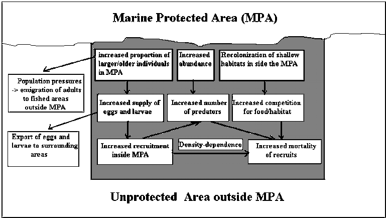Figure 3.7 Some characteristics of MPAs, particularly with respect to recruitment and density dependence, and their potential contributions to fisheries in surrounding areas. Modified from Planes et al. (2000).