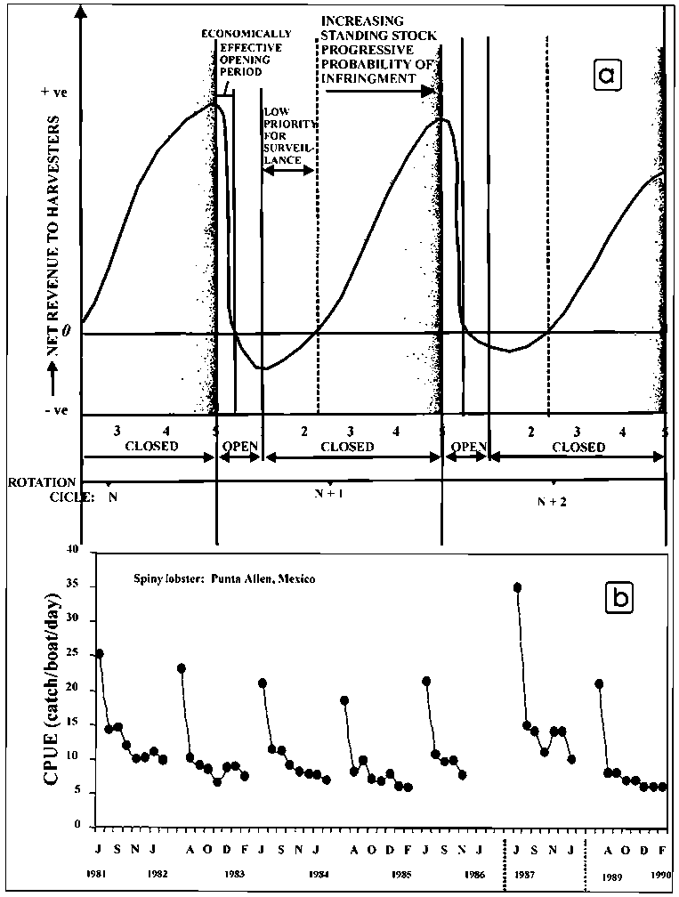 Rotational harvesting, enforcement and economic factors. Caddy (1993b) outlined criteria for setting time periods for rotating closures in sessile or sedentary resources, together with some guidelines for enforcement of rotational closures. He defined an open season as consisting of two periods: a "useful" one, when net economic revenues are positive and a "wasteful" period when stock abundance and expected economical benefits are too low to justify exerting effort in that area (Figure 3.9a). During this "wasteful" period, surveillance can be less intense, especially in areas recently closed because there is less incentive for illegal fishing. Figure 3.9b shows the monthly mean CPUE values for seven fishing seasons (1981-1985, 1988 and 1989) between July and February for the spiny lobster (Panulirus argus) at Punta Allen, Yucatan Peninsula (Mexico). This fishery is managed by the local community, and thus fishing operations are limited only to members of the cooperative. This area is also inserted within the range of a Biosphere Reserve, which assures low human intervention levels. Here poaching is minimal and operational management regulations (e.g. a closed season between March and June and a minimum legal size of ca. eight cm of cephalotorax length» 14.5 cm of tail length) are respected (Figure 3.9b). CPUE values (kg/boat/day) recorded through the 1981-1990 fishing seasons showed a maximum at the start (July) and a minimum at the end (February) of the fishing season (see Castilla and Defeo, 2001 for review). The conceptual MCS model provided in Figure 3.9a could apply here, particularly because unit prices remain constant throughout the period.