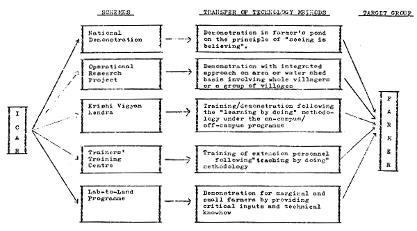 Research in agriculture or aquaculture is an input to increase and stabilize production. With this guiding principle, Indian Scientists during the last three decades have made sustained research efforts which resulted in the development of modern high yielding production technologies. These technologies have revolutionised the farm production in the country. The results of the research to be relevant for general adoption are tested for their feasibility and economic viability on the farmers field in the target area, before they converge into a modern technology, which is a combination of several practices consisting of a 'Package'. The 'package' is then transferred to the farmers or and users of the research results through various transfer of technology agencies.