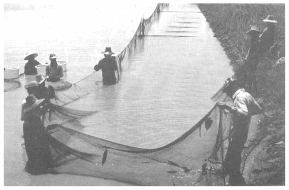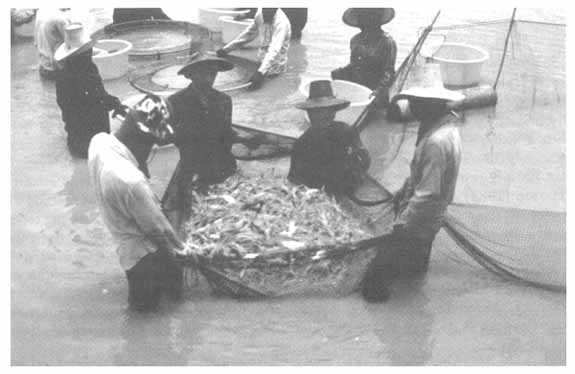 In ‘pure’ batch culture, the prawns are harvested by a combination of seining, hand collection and, where there is one, collection from a harvesting sump. This is carried out when sufficient of the prawns have reached marketable size or when the cessation of farming activities is necessitated by lack of water, temperature fall, etc. Where continuous culture is practical, ponds are rarely drained. Marketsized animals are removed by seining with an appropriate mesh size net on a regular basis. This may be once every 2–4 weeks; sometimes only part of the pond is seined on any particular occasion to avoid total disturbance of the habitat. Re-stocking may take place in the continuous system one to six times per year.