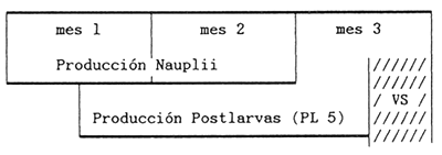 Producción teórica 5.106 larvas/tanques y ciclo, 2 × 4 tanques de hormigón de 170 m3.