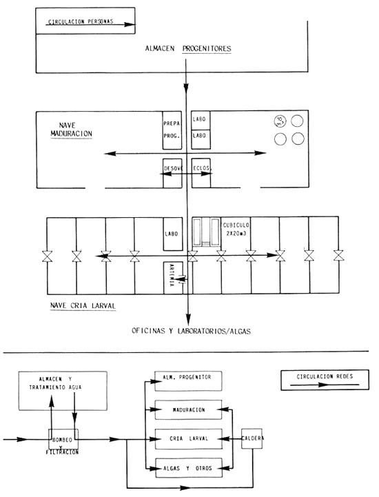 Edificio de más o menos (60 × 18 m) (1 000 m2) con una sala de maduración y una sala de cría larval con cubículos (8) del mismo tipo que en Santa Cruz.