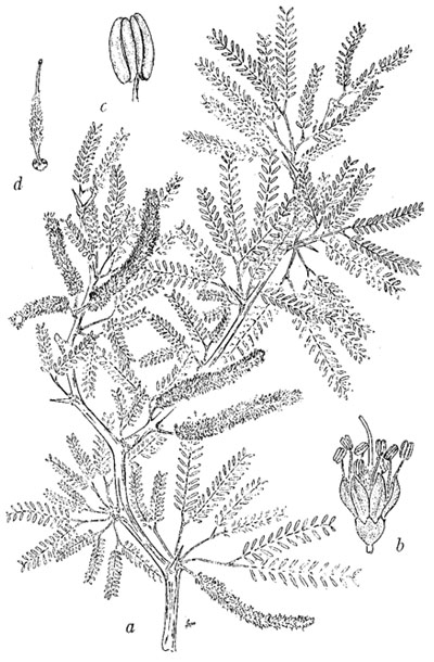 Mimosaceae. Prosopis alpataco. a) rameau avec fleurs (× ⅔); b) fleur isolée (×); c) anthère (×); d) pistil (×). Pisano, E. et Bravo, R., No. 852. Original F. Sudzuki.