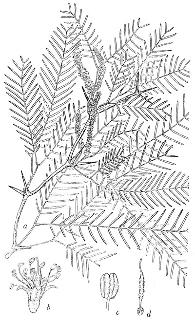 Mimosaceae. Prosopis chilensis. a) rameau avec fleurs (x ⅔); b) fleur isolée (x); c) anthère et partie du filet (x); d) pistil (x). Pisano, E., No. 703. Original F. Sudzuki.