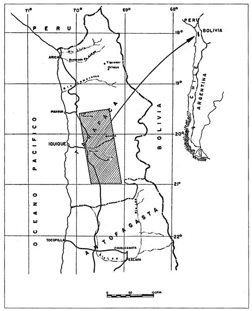 La Pampa del Tamarugal 6, qui doit son nom au Prosopis tamarugo qui y pousse, forme entre les latitudes 19°33' et 21°50'S un vaste plateau incliné d'est en ouest avec une pente de 1 à 2 pour cent, d'une altitude variant entre 300 et 1 200 m (Billinghurst, 1893). Un document historique important est la carte d'o'Brien, mentionnée par Bermúdez (1975). Elle mesure 0,96 × 1,29 m, et est datée du 14 août 1765, au village de Tarapacá. Elle couvre un espace compris approximativement entre 19°35' de latitude Sud et le village de Matilla à 20°32'S. Pour donner une image rapide et purement visuelle de la planimétrie, la carte présente un décor dessiné, non dépourvu de sens artistique, sur lequel se détachent très nettement les contours des versants des cordillères littorale et andine. Entre ceux-ci, orienté nord-sud, apparaît clairement la surface plane de la dépression centrale désertique.