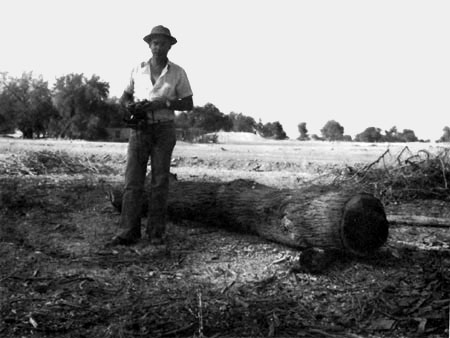 Destruction de la forêt naturelle de tamarugo aux environs de Canchones. Coupe à la hache d'un tamarugo de plus de 40 ans.