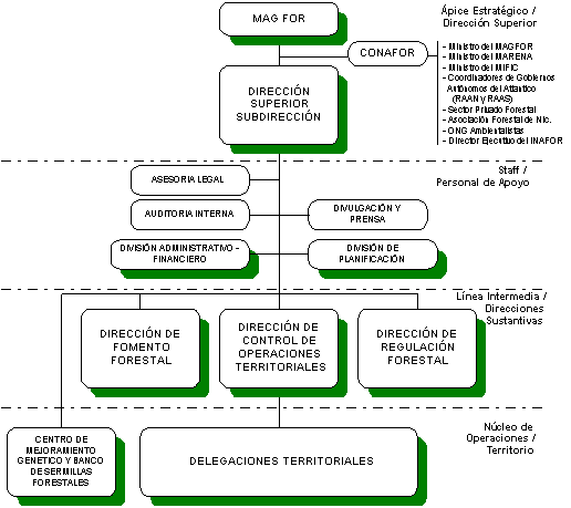 INAFOR depende orgánicamente del Ministerio Agropecuario y Forestal, siendo su Director y Sub Director nombrado por el Presidente de la República a propuesta del Ministro Agropecuario Forestal. La Comisión Nacional Forestal actúa como un órgano de consulta y coordinación para la Dirección Superior (ver Fig. 1), la que responde al Ministro del MAG-FOR.