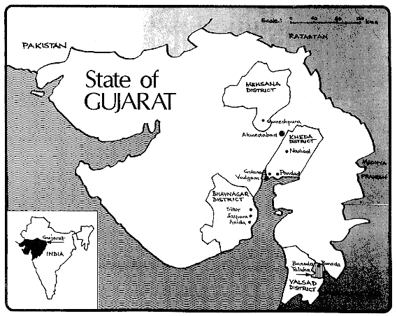 The locations selected for the case studies can in no way be considered random and the number of cases was limited. The information, therefore, should be considered illustrative and conclusions cannot be generalized to all of India or even all of Gujarat. The sites were selected in areas in which there was high participation in farm forestry so effects could be determined. The sites selected were those with an extended period of experience with farm forestry so farmers had had a chance to observe and develop informed views. Case studies were also purposely selected to provide contrasts in the type of institutional support offered to farmers.