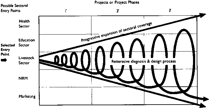 Interventions of sectorally anchored projects may be broadened to address issues that may emerge through the iterative diagnosis and reorientation process characterizing SLA (Figure 11; FAO/DfID, 2000).