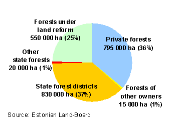 After the regaining of independence in 1991 the restitution and privatisation process started. By the end of 2002, 3,1 mil. ha of land (of which 1,6 mil. ha of forest land) has been registered in the Land Cadastre and 1,2 mill. ha of land (0,6 million ha of forest land) will be registered in the next 3-4 years to complete the land reform. State-owned forests are managed by the State Forest Management Center (830 000 ha) and by other state institutions (20 000 ha). 795 600 ha of private forests are mostly owned and managed by individuals (80%), but forest companies are increasing their share. Private forest ownership is characterised by the big number of owners (about 70 000) and the dominance of small forest holdings. The average area of forest land in a private property is 10 ha and about 80% of the private holdings have forest land less than 20 ha. Municipalities are playing a minor role as forest owners in Estonia.