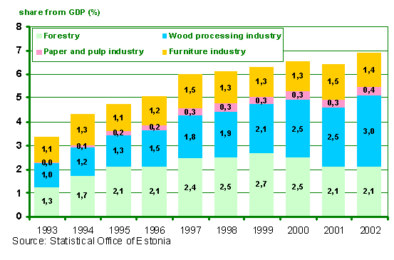 After a deep recession at the beginning of the transition to the market economy the forest sector companies have experienced a rapid and steady increase in 1990s. The development of the forest sector has stabilised in the recent years - share from the GDP has remained at 6-7% level. Especially quick developments took place in the wood processing industry reflecting investments into sawmilling and further processing in the last 5-7 years (share from the GDP has grown from the 1,0% in 1993 to the 3,0% in 2002 by current prices). Forestry (from 1,3% to 2,1%) and furniture industry (from 1,3% to 2,1% respectively) developments have not been so dynamic. Pulp and paper industry has not regained the position it had in the 1980s (share was only 0,4% from the GDP in 2002).