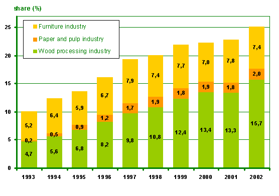 The production of forest industry accounted for 25% of the total production of manufacturing in 2002, 14% of the total production was produced by the wood processing, 3% by the pulp and paper processing and 8% by the furniture industry.