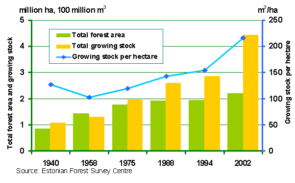 There has been constant and rapid increase in forest area and growing stock of stands during the last 60 years - area increased by 2,6 times (from 0,9 mill. ha in 1940 to 2,2 mill. ha in 2002) and the growing stock by 4,1 times (from 108 mil. m3 to 444 mil. m3 respectively). Forest area has increased as a result of the afforestation of unused agricultural lands and the drainage of bogs between 1960-1980s. Due to modest felling volumes in the period 1975-1995 the growing stock have increased from year to year as well. The average growing stock of stands has been increasing since the 1950s by forest melioration (increasing productivity of forest lands), afforestation of non-used agricultural lands and changes in the age structure of stands (the average age of stands has increased).