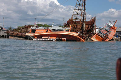 The total damage to the fisheries sector in the southern province (US$ 47.2 million) was much higher than other agriculture subsectors. This does not include the opportunity cost that the affected fishermen/aquafarmers have to forgo during their forced inactivity until they undertake the next catch/harvest. This tsunami severely affected not only fisher folk and aquaculturists, but also fisher folk who earn additional income from ecotourism. The estimated damage as reported by the Fisheries Rescue Coordination Centre on 10 January 2005 includes damage to 3 741 small fishing boats, 1 199 large fishing boats, 554 ecotourism boats, 6 063 fish and shellfish cage farms (totalling 609 869 sq m), 42 shrimp farms (266 rai), 573 hatcheries (86 818 sq m), 17 shellfish concession plots (819 rai) and 47 063 sets of fishing gears. In addition, 83 public harbours/piers were affected whereas the damage to private jetties/piers for private boats or fishery associated businesses (e.g. ice plants, gas stations, fish landing and markets, etc) has not been assessed yet.