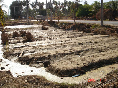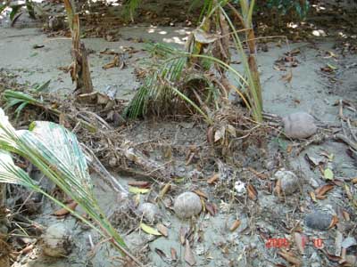 Casuarina, coconut palm, Terminalia and Tamarindus appear to have been relatively more resistant to the tsunami than other species found along the coast, such as Leucaena leucocephala (ipil-ipil). Kapok trees (Ceiba pentandra) appear to have offered a medium degree of resistance. The mission team recommends that more scientific studies, including on the long-term effect on root-exposed standing trees, be carried out. This would provide important information on the appropriate species to plant as part of a programme to rehabilitate the area.