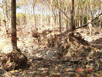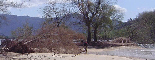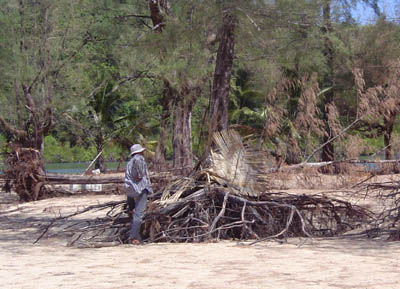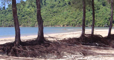 Fig. 26. Trees on sandy beaches were the most affected by the tsunami. This photo shows serious sand erosion. A large amount of sand has been washed out and the tree roots are now exposed. (Courtesy of the Department of Marine and Coastal Resources)