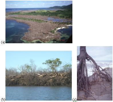 Hurricane Mitch (1998) was the second deadliest hurricane on record at the time. The eye of the storm passed directly over three countries (Honduras, Guatemala and Mexico). Damage to the region’s coastal mangrove ecosystems resulted from three different mechanisms: winds, waves and sediment burial. Extreme winds (up to 287 kilometres/hour) defoliated and uprooted mangrove trees along the Caribbean coast, most notably in the Bay Island of Guanaja, which lost some 97 percent of its mangrove forest cover as shown in Plate 2.1 (Hensel and Proffitt, 2000). High wave activity eroded shorelines some 200 kilometres to the southwest, along the Caribbean coast of Guatemala (Punta de Manabique). Mangrove forests within the eroded zone were destroyed, and the remaining mangroves were buried with up to 1.2 metres of sand. Along the Pacific coast, damage was primarily attributable to the burial of mangrove forests by upland sediments, brought to the coastal area by massive flooding, upland erosion and mud and debris flows. These three mechanisms of hurricane damage had different impacts on coastal mangroves and led to different trajectories of recovery. The area of greatest damage was the Bay Island of Guanaja, where high mortality and the lack of natural regeneration made active restoration a priority. Over 27 months after the cyclone, severe chronic impacts remain evident, as recovery has not progressed to any significant degree. Wave-induced erosion and sedimentation some 200 kilometres away from the hurricane track also caused significant mangrove mortality.