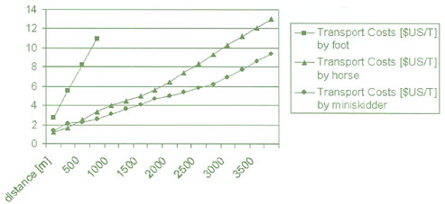 In view of the total harvesting and transport chain, an average outlay of about US$ 8 could be allocated for skidding, taking into account the expected upper limit of $US 17 per ton for the material delivered at the processing site, US$ 4 per ton for felling and bunching, and US$ 5 per ton for road transport (including loading) or river rafting. The table shows that costs for manual transport rises sharply, and would allow this method to be feasible for distances of up to 600 m only, not withstanding considerations of ergonomic limitations for repeated applications of this method.