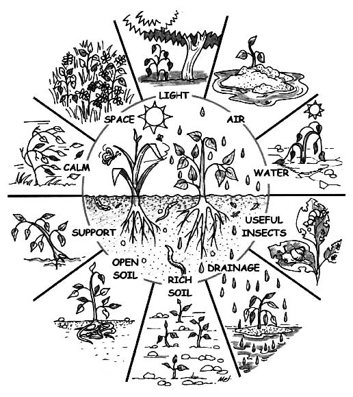 4. What�s wrong? (for older learners) Learners look at the Guide and discuss what�s wrong with the plants in the outer circle (they lack the elements of light, air, water etc). Praise (but do not demand) scientific explanations.