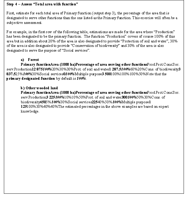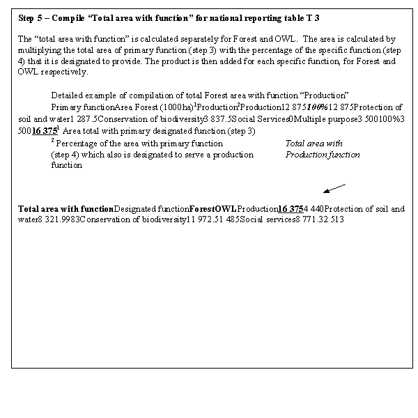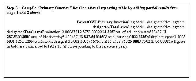 Note that for FRA 2005 information is requested for areas with “Primary function” and for “Total area with function”. The areas which are recorded as “Primary functions” are exclusive and should only be counted once – consequently the total areas for Forest and Other wooded land should match the respective totals from table T1.