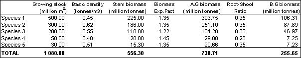 If no specific biomass functions are available, the following general formulas are used for calculating biomass from growing stock figures:
