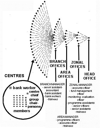 Figure 2 illustrates the various management and supervision units in Grameen Bank. At the time of writing, there are in operation 5 zonal offices, 20 area offices, 248 branch offices and 8850 centres, of which 6524 are female. In total, the Bank has 3000 employees. Approximately 2500 constitute various grades of bank staff, referred to in this paper as bank workers, who are directly engaged with the centres. The development facilitation functions and the service functions are operationalized through these units in interaction with the poor in the centres.