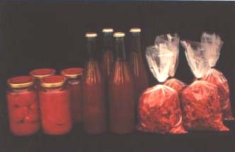 99. Peeled tomatoes, tomato pulp and dried tomatoes: three preservation techniques to be used when there is a glut of tomatoes, thus saving food which would otherwise go to waste.