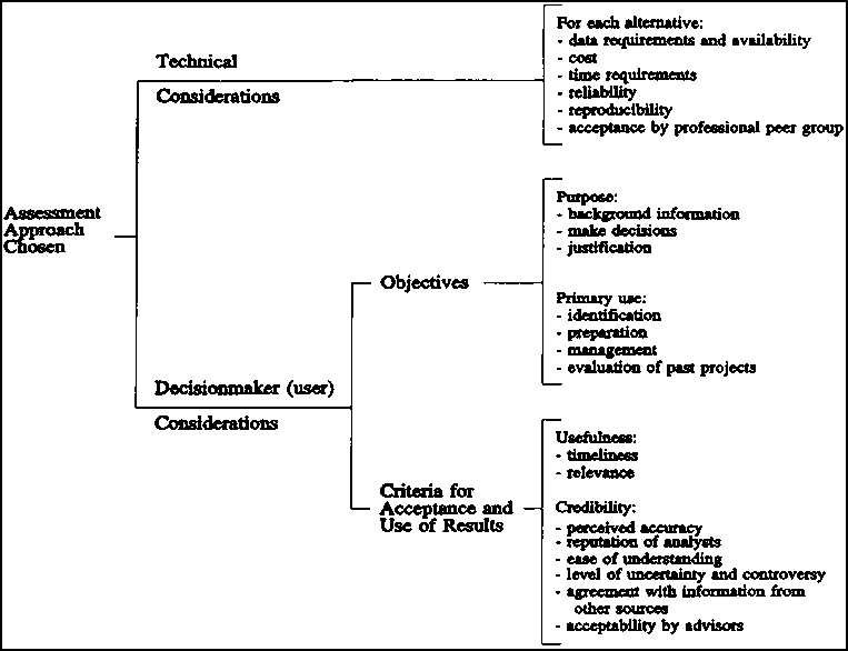 The assessment should not only be effective, that is, provide appropriate answers to the questions being asked, but also be realistic in its approach, in recognizing the practical constraints under which the assessment is being conducted. Consideration of these constraints will help the analyst plan and organize the assessment. Figure 2.1 indicates the considerations that should be taken into account.
