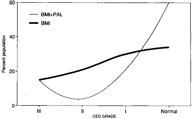 Later, detailed measurements of adults in Ethiopia and India suggested that the use of a cutoff point of 1.4 PAL can be very problematic. It is possible for women to sustain economically relevant and useful activities for up to 4.5 hours a day without exceeding a daily energy turnover value of 1.4 (Ferro-Luzzi et al., 1992). This is explained by the very low energy costs of activities performed sitting down which are undertaken during the rest of the day and amount to no more than 1.25 x BMR. This contrasts with a theoretical value of 1.4 for residual time decided upon by the Joint FAO/WHO/UNU Expert Consultation (ibid), suggesting perhaps, the need for a reexamination of the value recommended at that time. There was also a marked variation in individuals in terms of their activities from month to month and most of the population at one time or another had PAL values below 1.4. In women, the duration of work was only marginally reduced for those individuals with low BMI. Even women with a BMI c 16.0 had no apparent reduction in the time spent on these activities. Neither the intensity of work nor the time involved in social and other spontaneous activities was reduced. By contrast, the men did seem to display some evidence of behavioural adaptation and this may reflect their sensitivity to restricted intake of food which is greater than that of women who have a higher body fat content and energy stores for the same, albeit low, BMI. The combination of physical activity (as an indicator of activity turnover) with BMI for estimated degree of CED produced an unusual distribution that did not follow the classical Guassian model; a distribution unlike that of the BMI alone (See Figure 1.1).