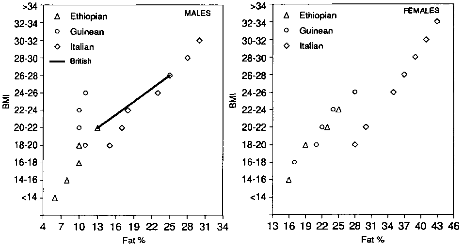 An analysis by Norgan (1990) indicates that fatness or energy stores derived from BMI measures may vary in different population groups. Three rural communities in India, Ethiopia and Papua New Guinea were compared using a modelling approach and this indicated that the fat or energy stores at a given BMI differed markedly in the three population groups (See Table 2.4). Quite different levels of energy stores are thus encountered in different population groups (all from developing countries) for the same BMI. The differences between sexes in body energy stores represented by an equivalent BMI are also confirmed.
