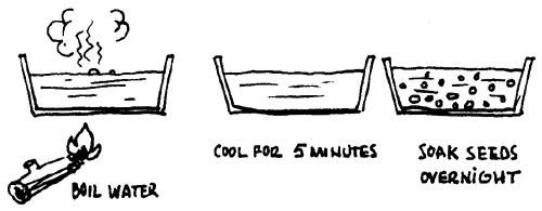 In order to get the seeds to germinate quickly in 14–28 days, you need to treat them with hot water. Boil some water, cool it for 5 minutes and then soak the seeds overnight, using at least three times more water than seeds in order to cover the seeds completely. (Some agronomists also recommend mechanical scarification which they consider to be safer under semi-arid conditions.)