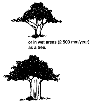 This tree grows in dry areas with little rainfall (600 mm/year), sometimes in the form of a shrub with many branches,