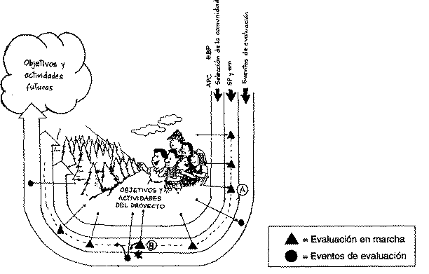Para usar un ejemplo, la evaluación continua no encontró nada fuera de lo normal en el punto A, y todo iba tal como se había planificado. Sin embargo, se descubrió la existencia de problemas en el punto B. Se realizó un evento de evaluación para conseguir más información sobre los problemas. Como resultado de ello, se tomó la decisión de cambiar algunas actividades. Estos cambios también trajeron una ligera modificación en el seguimiento.