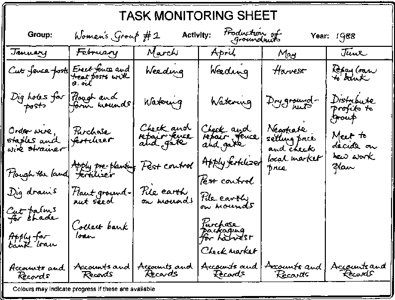 As the examples show, monitoring charts can be very simple and designed to be filled in just by checking off items. The preparation and use of these charts make it easy for the group to monitor its activities and stimulate discussions about why activities progress or not.