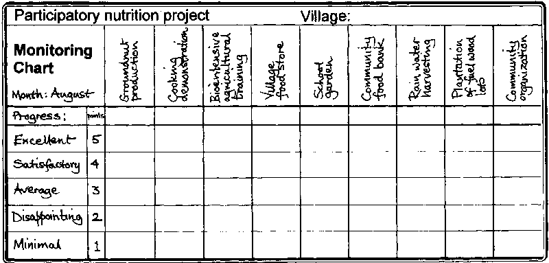 Most of the techniques used for participatory appraisal of food and nutrition can also be used for monitoring and evaluation. To facilitate the collection and recording of information, each working group can develop a monitoring chart with the assistance of the development worker. An example is given in Figure 8.