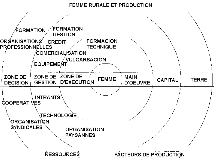 Le schéma ci-après montre, synthétiquement, comment les femmes rurales se situent dans le système de production et quel est leur degré d'accès aux facteurs de production (terre, capital, main-d'oeuvre)3 et aux ressources.
