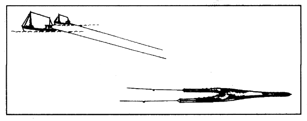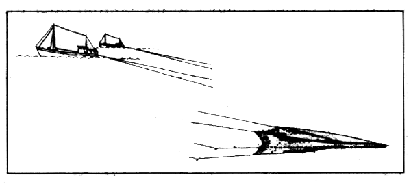 1. Hasty departure - sudden increase in speed, clouds of engine exhaust, bow wave, anchor being quickly hauled in.