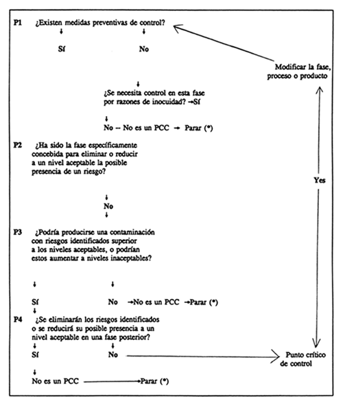 La determinación de un PCC en el sistema de HACCP se puede facilitar con la aplicación de una secuencia de decisiones, por ejemplo el Diagrama 2, que indica un enfoque de razonamiento lógico. La aplicación de una secuencia de decisiones deberá ser flexible, considerando si la operación está destinada a la producción, al sacrificio, a la elaboración, al almacenamiento, a la distribución o a otro fin. Deberá utilizarse como guía en la determinación de los PCC. Este ejemplo de secuencia de decisiones puede no ser aplicable a todas las situaciones. Pueden utilizarse otros enfoques. Se recomienda impartir capacitación en la aplicación de la secuencia de decisiones.