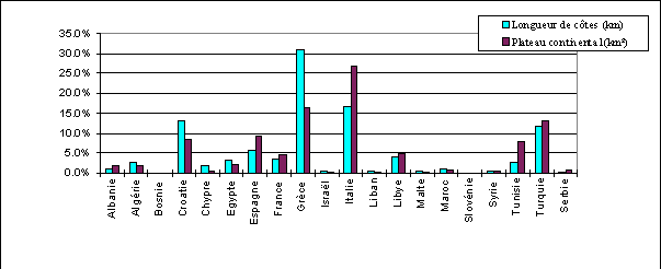 Figure 1. Répartition de la longueur de côtes et du plateau continental en Méditerranée (source : annexe 2)