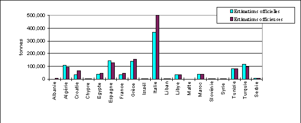 La figure 3 renseigne sur la répartition des captures entre les différents pays en fonction du mode destimation. On saperçoit globalement que cette répartition diffère essentiellement lorsque lon compare le groupe des pays membres de lUE et celui des pays dAfrique du nord. Daprès les estimations officielles, le premier groupe contribue à hauteur de 59,5% tandis que le deuxième groupe contribue à hauteur de 25,9%. Daprès les estimations officieuses, on obtient respectivement 63,9% et 21,9%.