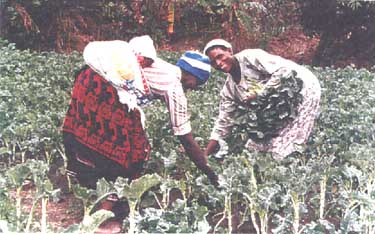 Zimbabwe. Women harvesting vegetables. The baby they frequently carry on their back while in the fields hardly makes their work any easier.